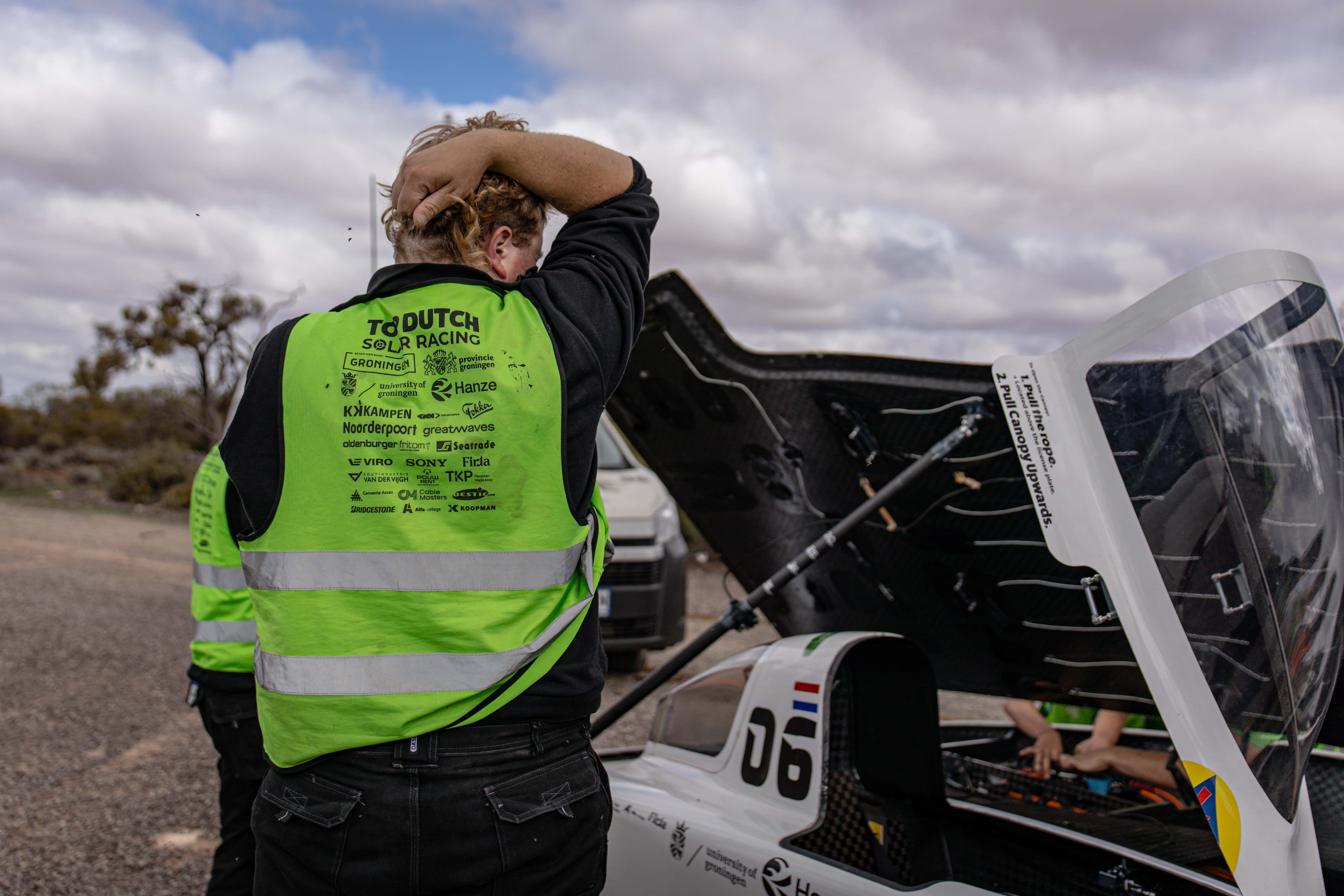 After one more unexpected stop, we had no choice but to trailer the car to camp. Once set up, our electrical engineers went straight back to work. The leading theory: a worn cable could have caused the interruptions all along. With a fix in place, all we can do is wait until tomorrow to see if we’ve finally solved the mystery.